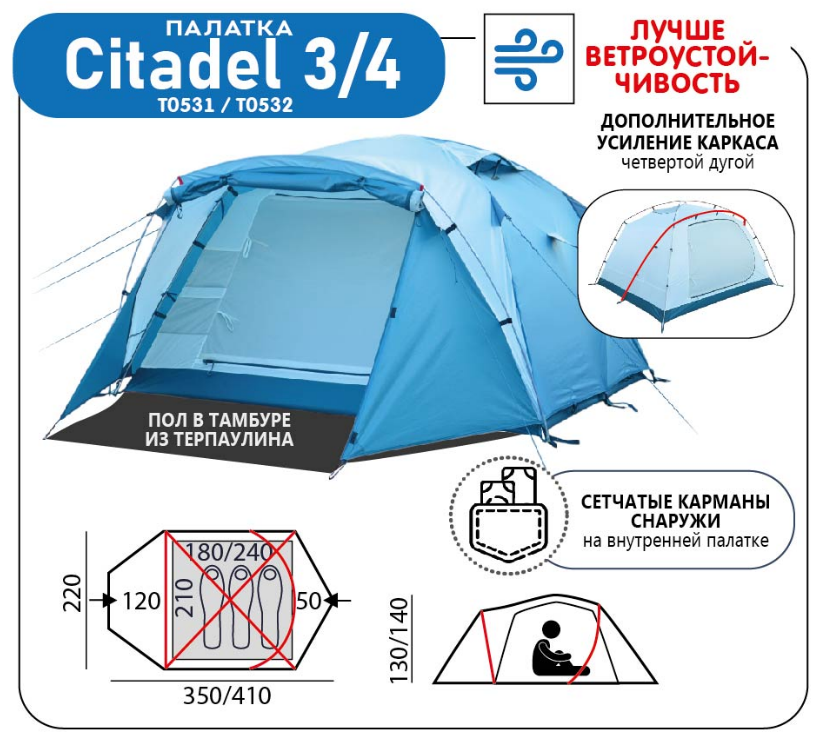 • Материал тента: 100% полиэстер 75D/210T PU W/R UV50+